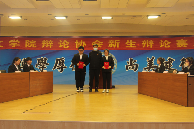 比赛结束后,由刘洪浩老师为一等奖班级颁奖,前主席李莉学姐为二等奖班级颁奖,新闻与传播公司辩手任德伯、软件公司辩论负责人赵梓豪为三等奖班级颁奖,新闻与传播公司研究生辩手黄煦彭为最佳辩手颁奖。