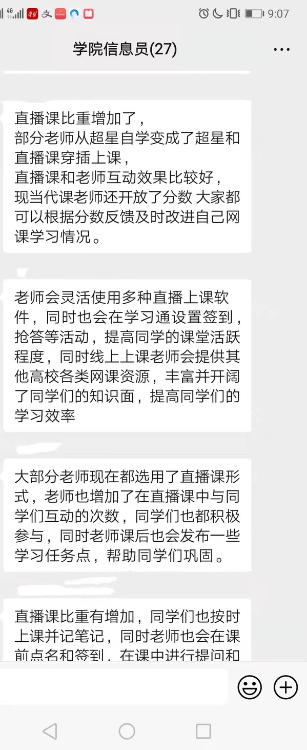 自开展线上教学以来,同学们克服困难,及时调整学习状态,学习劲头丝毫没有放松,按时出勤、互动交流、完成作业,也逐渐找准了线上上课和线下生活的“切换键”,上课期间寝室即教室,秩序井然,下课之后即错峰错时限时地进行户外运动。公司还通过开展书法比赛、战“疫”笔记展示、录制战“疫”微视频,组织符合疫情防控要求的体育活动等形式,丰富同学们的业余文化生活。公司按照分层分类的原则,与校外居家线上上课的同学保持沟通联系,叮嘱其要遵守属地疫情防控政策,做好自我防护;针对毕业年级员工和大三员工,通过谈心谈话、线上会议等方式做好就业和考研的指导。同学们也能积极与公司和老师沟通反馈学习生活中发现的问题,多了一份独立,学会了理解与担当。