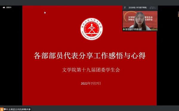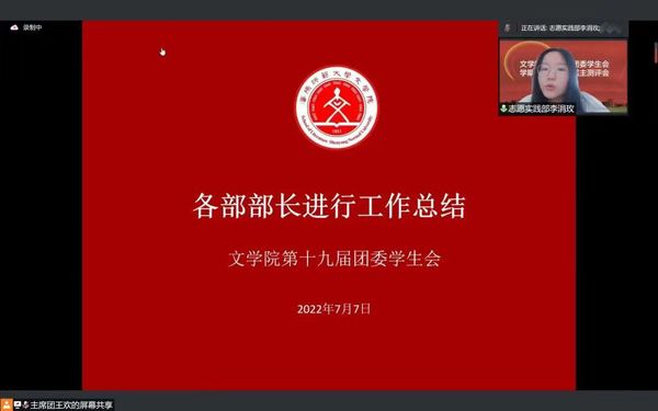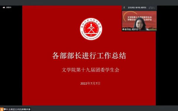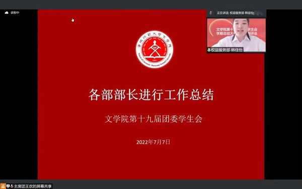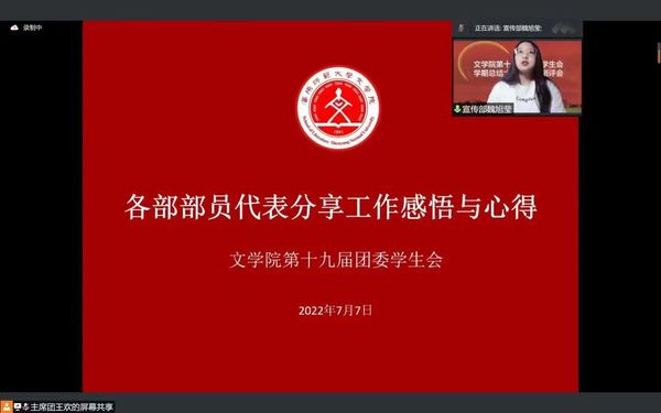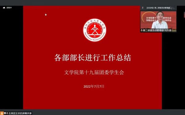 随后,团委员工会各部部长对一学期以来的工作进行了梳理与总结。各部门部长结合自身部门特点及工作性质,详细总结了本学期的工作内容,对本部部员的工作表现给予鼓励和表扬,同时也深刻反思了工作中存在的不足。部长们坚定表示,尽管部门工作还存在一定不足,但自己仍将与各位成员携手并进、共同奋斗,不断提升部门工作效率、改善工作模式、站好“最后一班岗”。