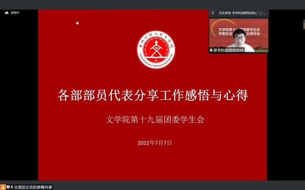 最后,高阳老师对第十九届团委员工会工作进行了简要总结与评价。高阳老师充分肯定了员工会全体成员的辛勤付出与共同努力,鼓励同学们立足当下、反思过去、着眼未来,并对本学期工作进行进一步分析与总结,对各部门的工作成果进行了简略的点评回顾与展望。高阳老师强调,各位成员须牢记团委员工会服务广大同学的基本理念,于日常工作中保持耐心、信心与决心,在实践中细致入微、充满赤诚,在实践中不断总结经验,使自己不断成长;须向先进榜样学习,虚心接受师长的引导与建议;须培养团队合作精神,积极、主动承担任务,配合伙伴展开工作。同时,还应注意端正工作态度,避免急功近利,力求圆满、高效地完成工作,促进经验积累与技能提升。高阳老师对同学们开展本学期工作以来的成长与进步作出了充分肯定,并真诚希望各位团委员工会成员能够踔厉奋发、笃行不怠,发扬文院精神,在未来的工作中收获累累硕果。