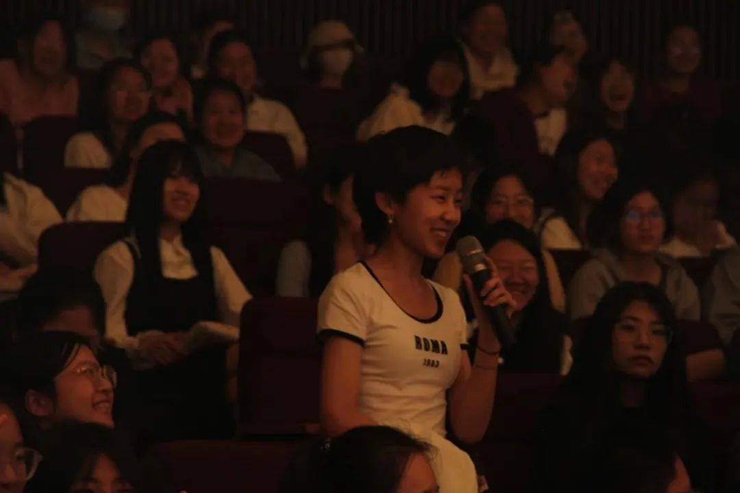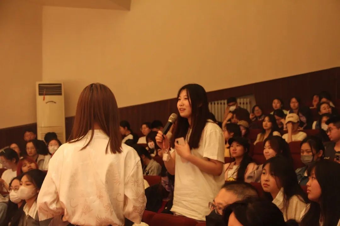 台上的演员全心演绎,台下的观众也有着自己的观后感悟,社团成员王艾琳在现场随机采访同学,一起畅谈独属于她们自己的那份“哈姆雷特”,增强同学们的参与感,进一步了解丁西林喜剧和民国时期的爱情。同学们积极互动、热情回应,观众的笑声和掌声就是对全体雅阁剧社社员最大的鼓舞和肯定。戏幕落,但仍有舞台上的光辉烙印在同学们的心中,经久不衰。