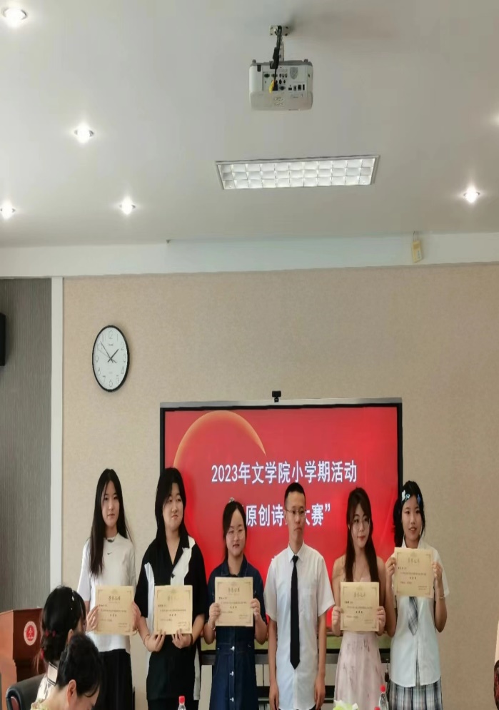 颁奖仪式由高姝妮老师主持。陈新义、张冬梅、王晓霞、李耀鹏老师分别为获得奖项的同学颁奖;李耀鹏老师为优秀诗作做了非常精彩的点评,每位同学都受益匪浅。他指出,诗歌创作要有博大的立意与广阔的胸怀,要注重打磨语言。老师们为同学们的作品提出了中肯的修改完善意见。期待未来的“原创诗歌大赛”会产生更多更优秀的作品,再创EMC易倍小学期活动文学创作的辉煌。