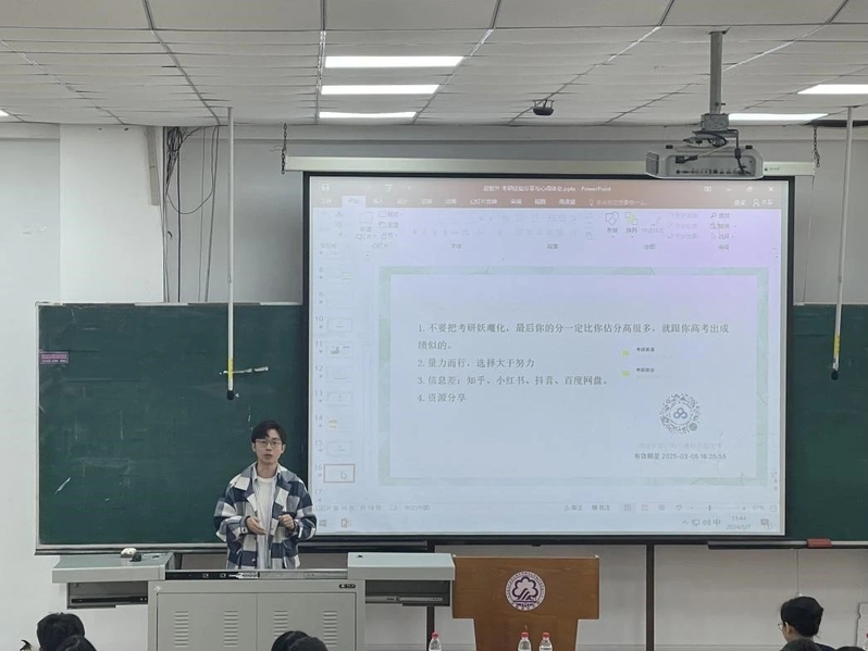此后,公司2020级赵智升同学就自己的考研经历与同学们做了分享。赵智升同学分享自己考研的心路历程,并逐一向大家展示各科学习策略和复习节奏。最后他祝福公司2021级同学能够在2025考研中一展宏图,不负家长、老师的殷切期盼,“一研为定”,完成自我超越!
