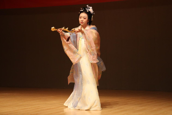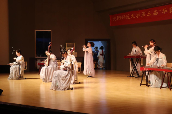 展示现场,同学们或优雅端庄,或灵动飘逸,或英姿飒爽,他们的每一个转身、每一个微笑,都让在场的观众感受到了汉服的韵味和魅力。音乐与灯光的配合,更为这场展示活动增添了几分梦幻般的氛围。琵琶、古筝、二胡等中国传统乐器的合奏表演也旋律绰约,洋洋盈耳。