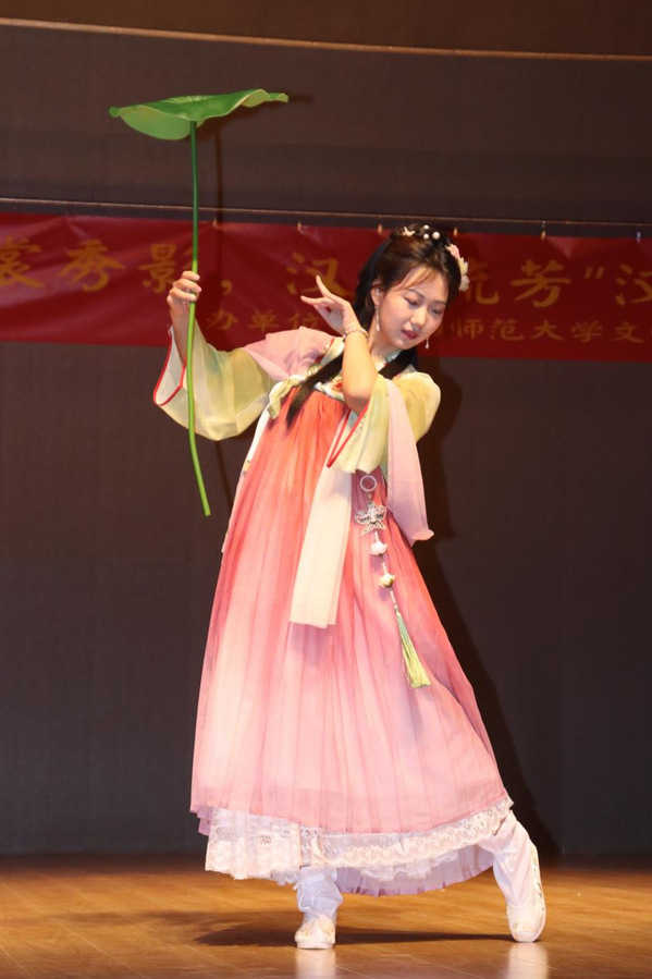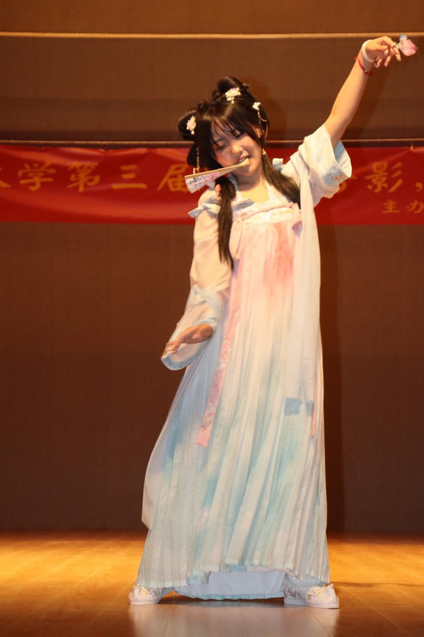 除了展示表演,活动现场还设置了汉服知识和中国古典文化常识问答等互动环节,让同学们在参与中感受汉服文化的深厚底蕴。