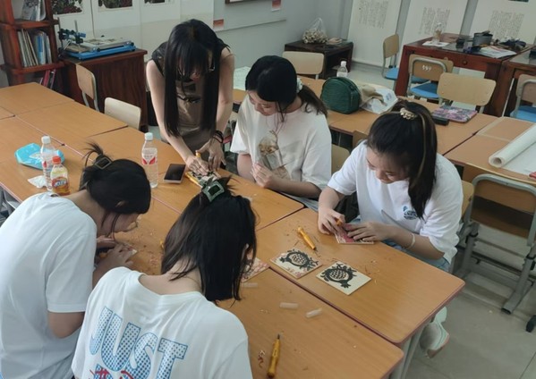 亲身体验过后,“文苑英华”社会实践团队第二站根据文化馆内辽宁省非遗传承人任凤山的介绍,走进桓仁版画艺术工作室进行深入调研。陈东明先生是辽宁省非遗传承人,团队成员参观了陈东明先生主办的桓仁版画艺术馆,体验了“石榴花开”系列小幅版画,在参观体验中了解到桓仁版画的艺术源头,是真正的优秀传统文化。在版画协会张丹老师的指导下,团队成员完成了自己的古法版画创作。