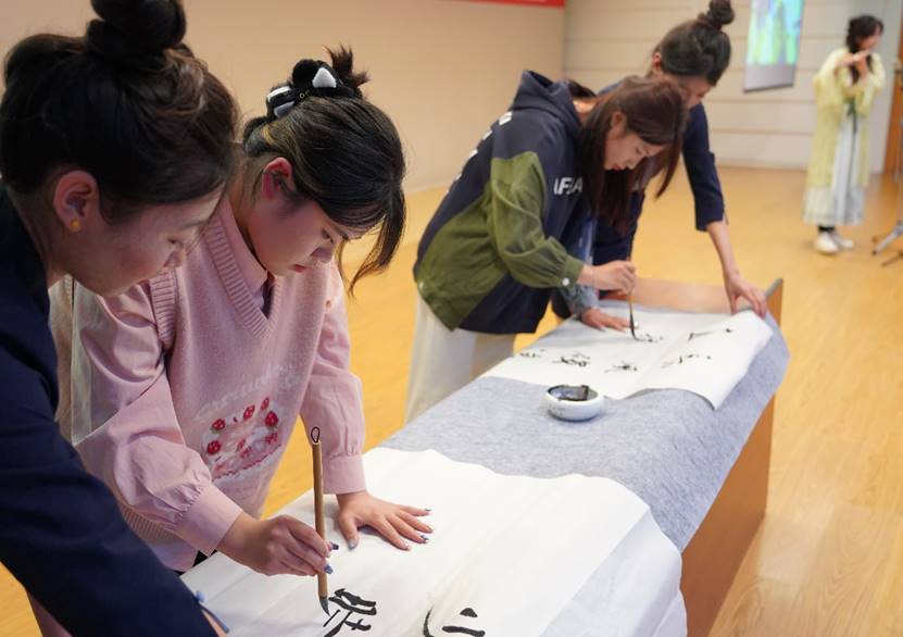比赛结束后,由评委组计算各组得分。在此期间孙海维同学、杨蕙亦同学和王婧宇晗同学为大家带来歌曲弹唱、舞蹈表演《水调歌头》,歌声如梦如幻,琵琶旋律悠扬,舞姿翩跹婉转,给观众带来了心灵的享受。随后刘雯昕同学的长笛演奏《萱草花》同样让人陶醉,与此同时王若萌同学与关楚淇同学,进行了一场精彩的书法展示,为本次大赛增添了浓墨重彩的一笔。王若萌同学挥毫泼墨,题写“长江破浪会有时,直挂云帆济沧海”,字体流畅自然,气势磅礴,寓意着对未来的无限憧憬与豪迈情怀;而关楚淇同学则笔走龙蛇,写下“须知少时凌云志,曾许人间第一流”,字迹遒劲有力,笔锋凌厉,展现出了她对于青春志向的坚定与执着。随着他们的笔触在宣纸上舞动,墨香四溢,为这场古诗文大赛增添了一抹独特的文化韵味。