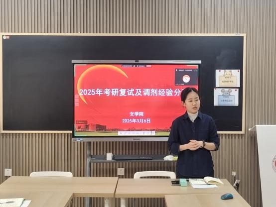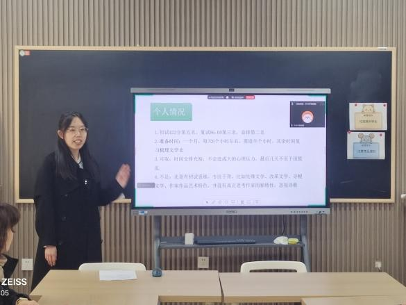 首先,孙加兴同学进行分享,她结合自已报考的专业,分别从复试准备、复试流程、复试心态、注意事项等方面进行了细致的讲解,为同学们提供了一套全面详尽的规划与建议。在分享中,她强调备战复试时应注重自己的学科知识储备,并注意相关知识点的延伸与拓展。复试过程中,要保持一个良好状态,仪表仪态要大方得体,精神面貌极为重要。回答考官问题时要有严谨清晰的逻辑,确保自己观点明确、论证充分、例证详实。同时,她指出在自我介绍、问答环节以及英语面试等方面可能会遇到的各种细节问题,提醒同学们要给予特别的关注和准备。
