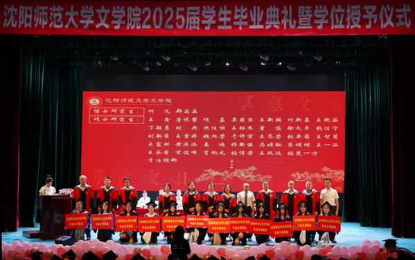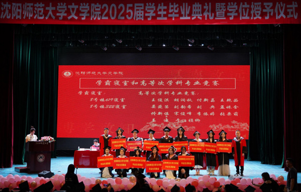 在学位授予仪式上,毕业生代表向书记汇报毕业情况。各位导师为毕业生拨正流苏,颁发学位证书并合影留念。