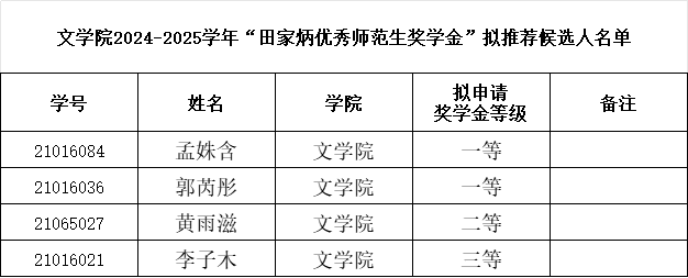 根据《EMC易倍平台田家炳优秀师范生奖学金评审办法》,公司成立了奖学金评定工作领导小组,严格按照评选标准和条件,遵循公开、公平、公正的原则,经员工本人申请、材料审核,公司工作小组初评,遴选出“田家炳优秀师范生奖学金”拟推荐候选人4人,现将候选人信息公示如下: